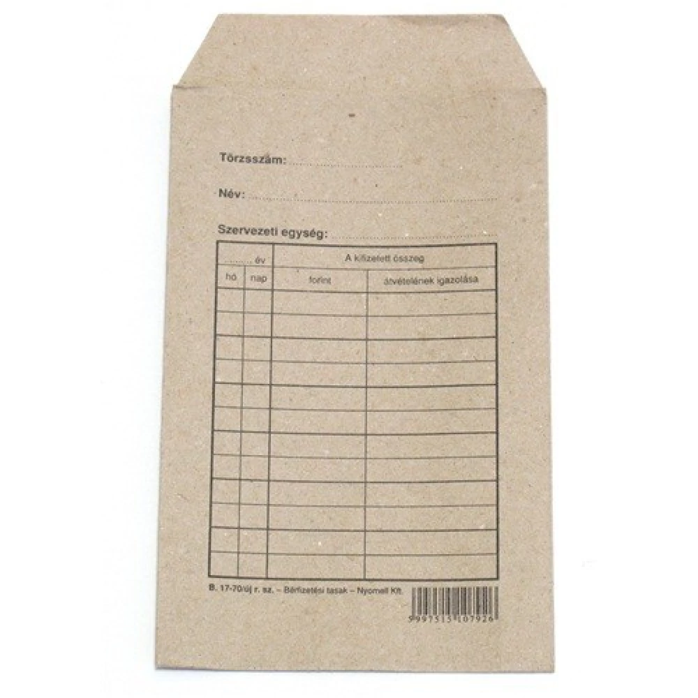 Bérfizetési tasak: 110x190 mm. A termék paraméterei: - Termékazonosító szám: B.17-70. - Mennyiségi egység: darab. Katalóguskód: 14505 Hiteles tájékoztatás: Elkötelezettek vagyunk termékeink biztonságának garantálásáért, nyomon követjük a termékbiztonsággal kapcsolatos valamennyi európai uniós és hazai szabályozást és biztosítjuk termékeink azoknak történő megfelelését. Az EU 2023/988-as számú Általános Termékbiztonsági Rendeletét (GPSR) is alkalmazzuk, így ha a termékeink biztonságát illetően fogyasztóként kérdése, észrevétele van, vagy esetleg balesetről van tudomása, kérjük, írja meg nekünk.