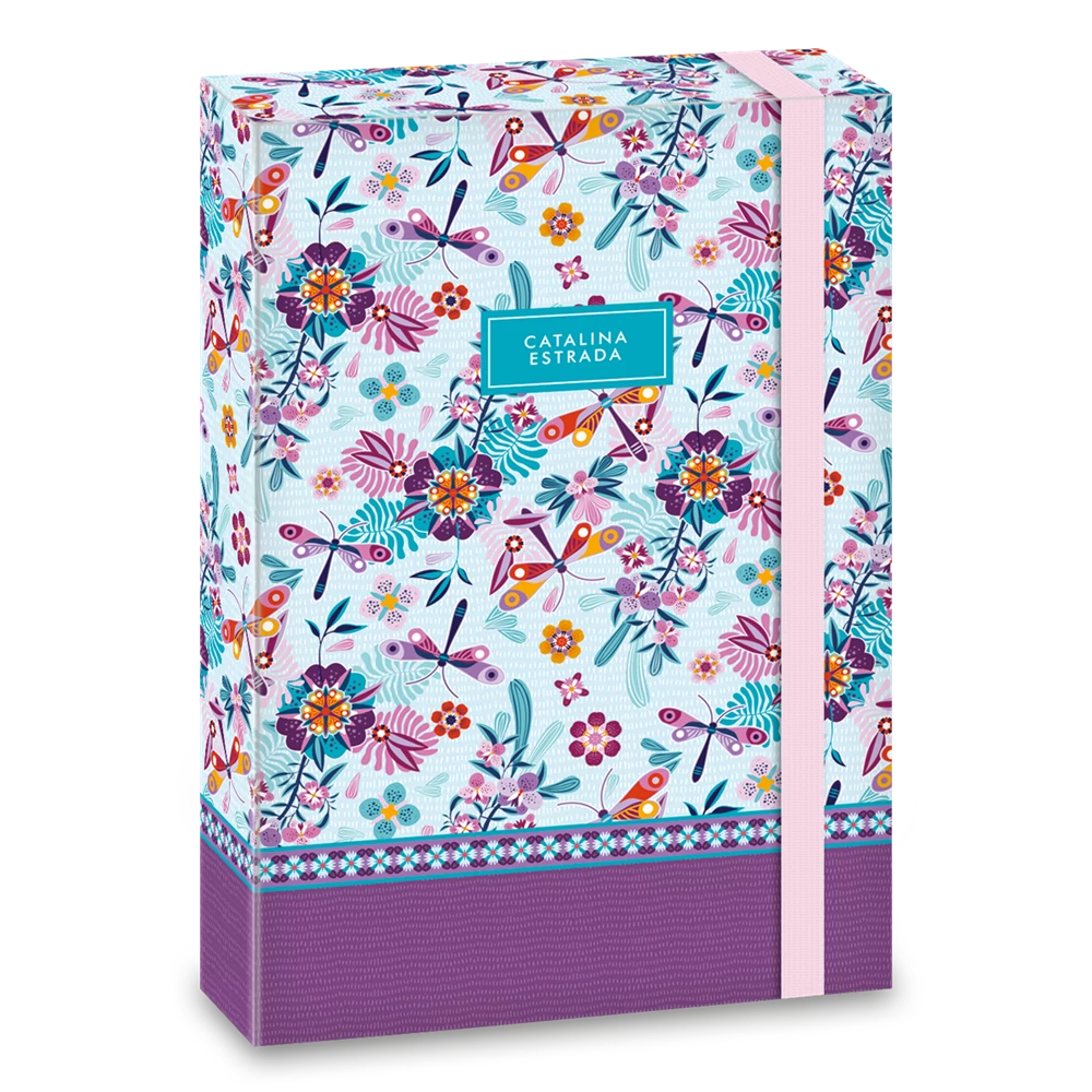 A/4 méretű füzetbox. Kemény, tartós kartonból, 4 cm-es gerinccel, fényes fóliával, 7 mm széles gumipánttal. Belseje egy színnel nyomott. Füzetek, iratok tárolására .