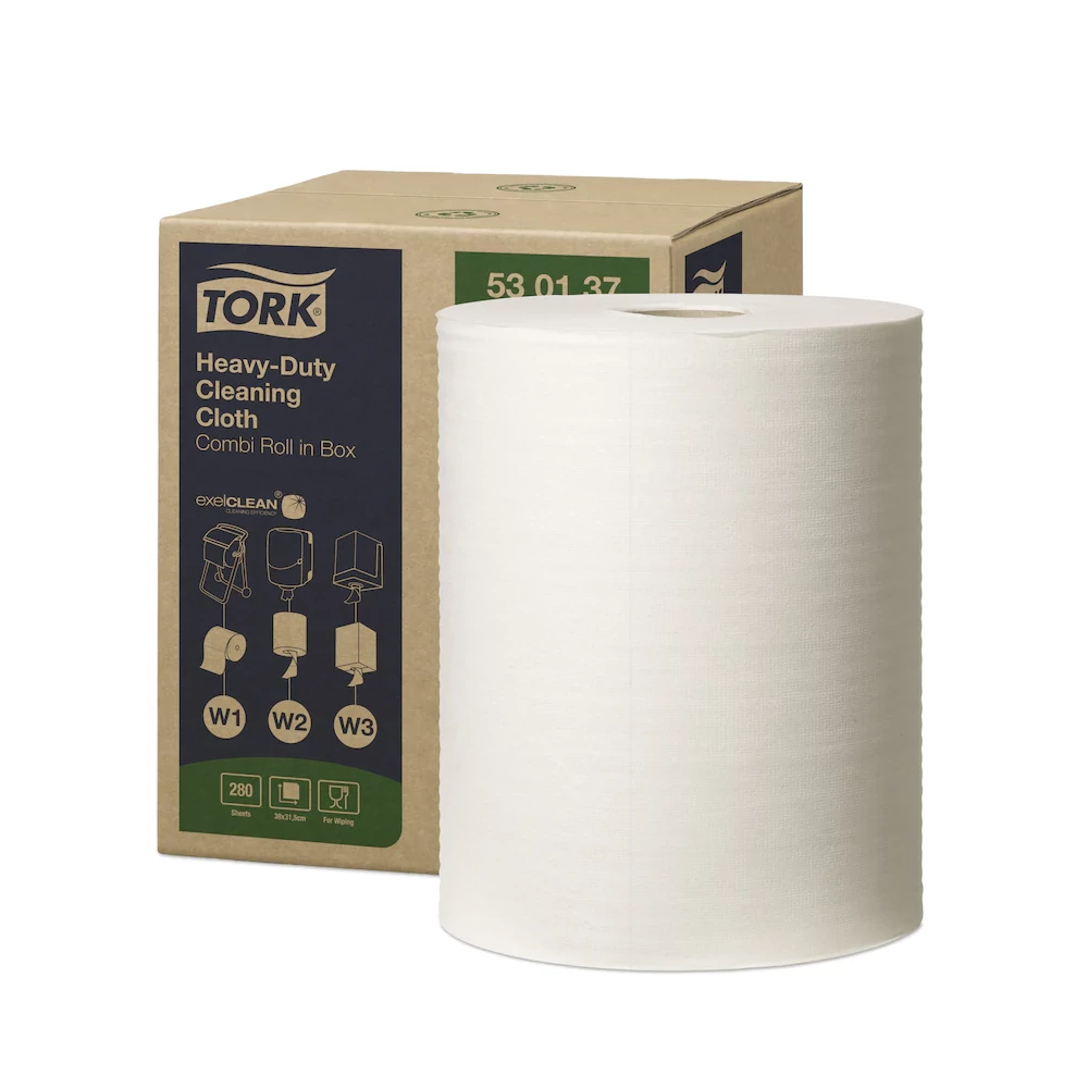 A Tork nagy teljesítményű tisztítókendő nedvszívó képessége igen nagy, a kendő maga pedig vastag és ellenálló: alkalmas az erős dörzsölésre, és közben nem foszlik szét. A legtöbb tisztítószerrel használható. Gyorsan és hatékonyan eltávolítja az olajat, a zsiradékot, a szennyeződéseket és a makacs foltokat, miközben védi a kezet a fémforgácsoktól és a hőtől. A kendő a Tork hordozható vagy falra szerelhető adagolóival használható, amelyek biztonságos és hatékony eszközök. Ezenfelül a Tork Maxi belsőmagos adagolóba vagy a Tork Maxi dobozos kombi tekercses adagolóba is behelyezhető, amivel lehetővé válik az egykezes adagolás.