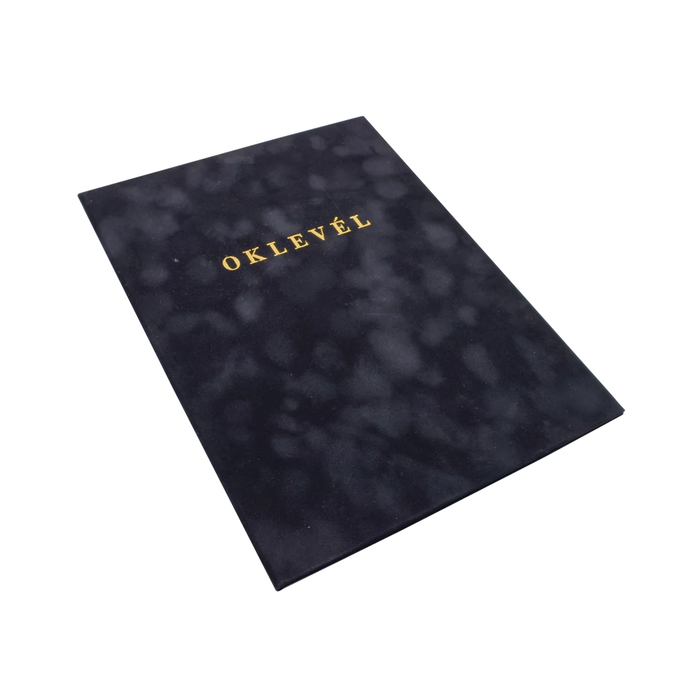 A4 méretű oklevelek tárolására alkalmas, plüss borítás, nyitott állapotban, jobb oldalon 4 szatén szalaggal. Borítón arany "OKLEVÉL" nyomattal méret: 233x312x7mm Katalóguskód: 44071