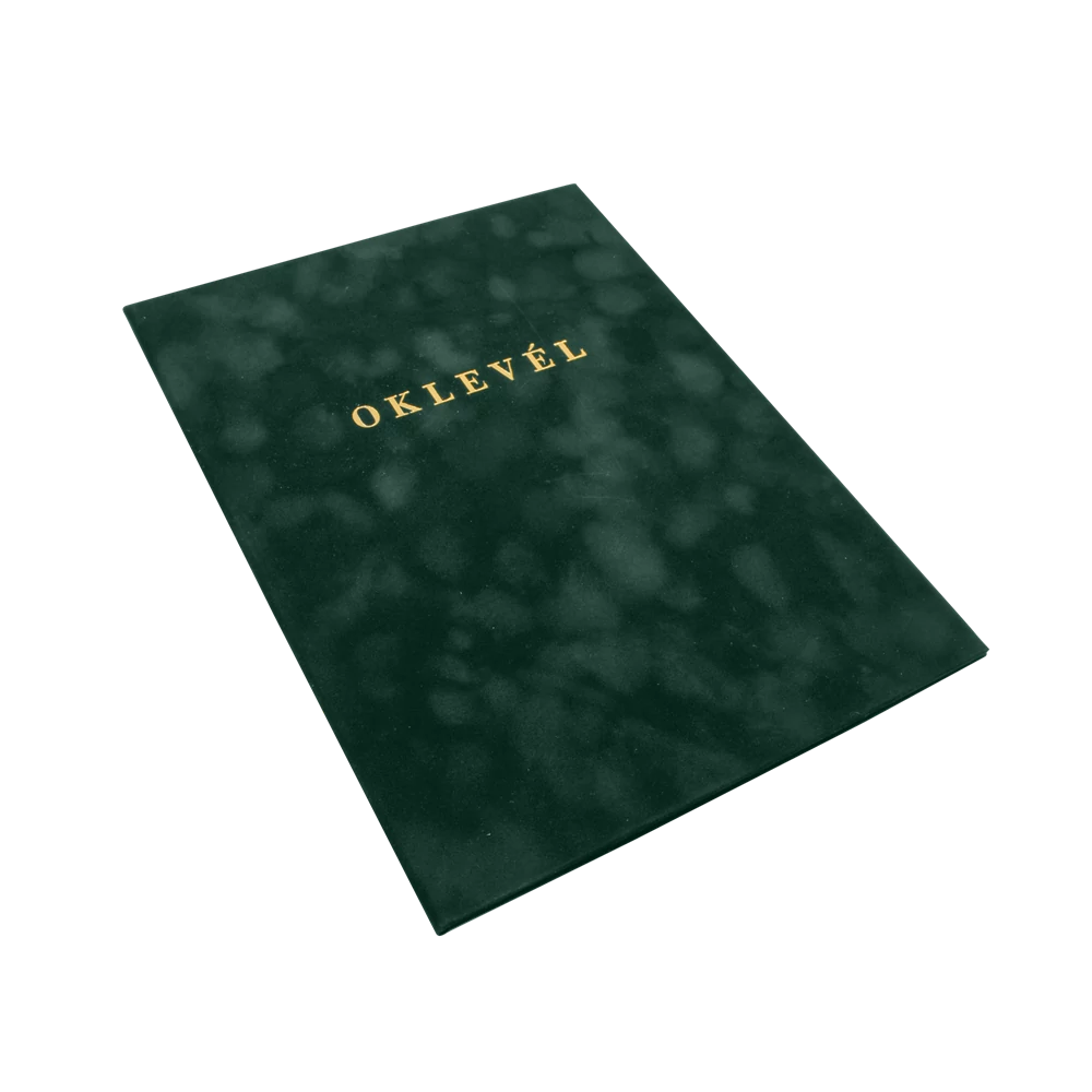 A4 méretű oklevelek tárolására alkalmas, plüss borítás, nyitott állapotban, jobb oldalon 4 szatén szalaggal. Borítón arany "OKLEVÉL" nyomattal méret: 233x312x7mm Katalóguskód: 44074