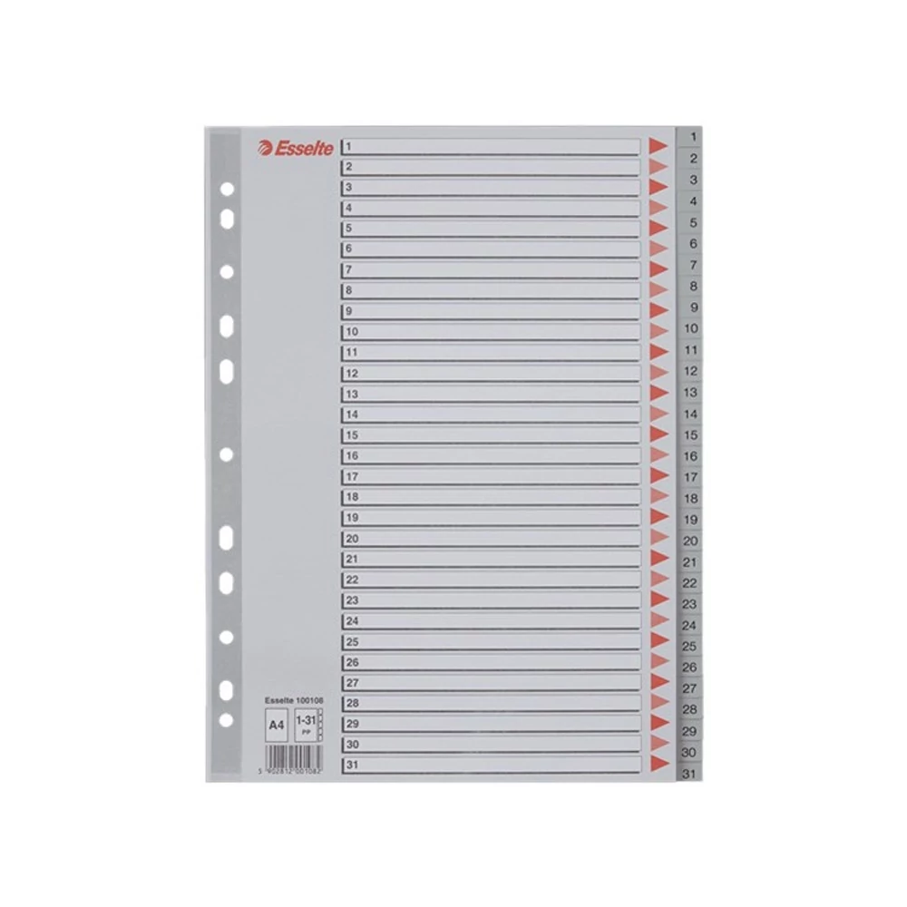 Szürke színű regiszter. Nagyméretű téglalapok az előlapon a tartalom feltüntetésére. Megerősített lefűzőrész az előlapon 1-31 felirattal rendelkező regiszter fülek a dokumentumok gyors eléréséhez Hagyományos, 11-lyukú lefűzőrész A4 méret 0,12 mm vastag PP alapanyag Katalóguskód: 35875